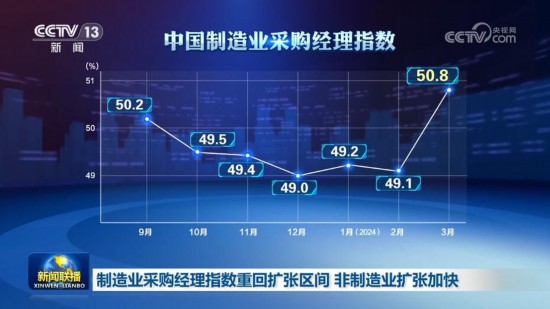 中国物流与采购联合会、国家统计局服务业调查中心今天(3月31日)公布3月份中国采购经理指数。制造业采购经理指数重回扩张区间,景气水平明显提升,非制造业继续加快扩张。